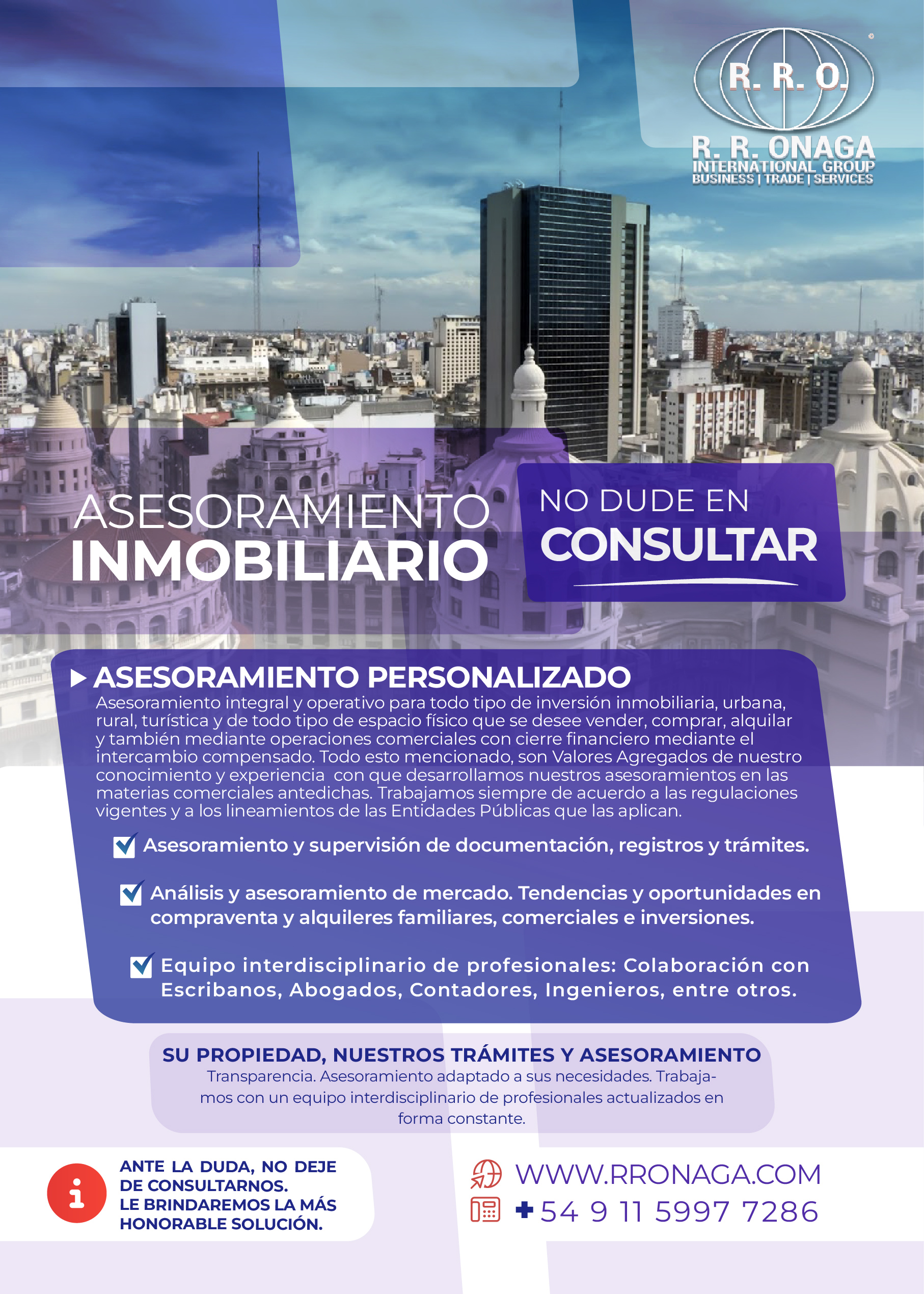 En R.R. ONAGA - ARGENTINA SH, entendemos que cada decisión inmobiliaria es un paso fundamental para su futuro. Por ello, ofrecemos una gestión estratégica que combina el análisis de mercado con la seguridad jurídica, garantizando transacciones claras y beneficiosas. Nuestro enfoque de Asesoramiento Personalizado integra a un equipo de profesionales (abogados, escribanos, contadores e ingenieros) para brindarle la "más honorable solución" en cada etapa.